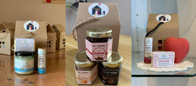 La petite maison classique contient: un baume à lèvres, un savon et une chandelle parfumée. La petite maison gourmande contient: un baume à lèvres, un savon et une bombe de bain en coeur. La petite maison caramel contient: 3 petits caramels de 45 ml chacun; fleur de sel, chocolat et café.